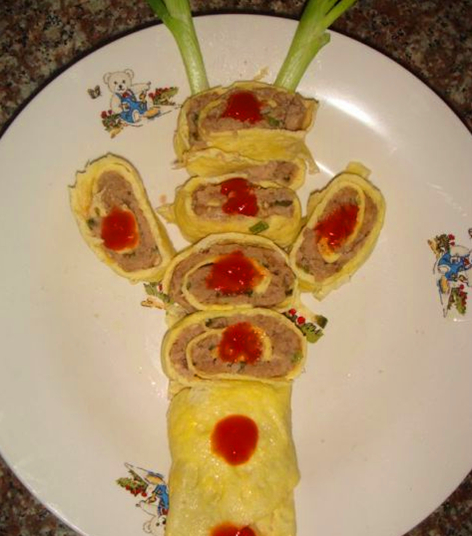 及以下步骤:放进锅里隔水蒸约15分钟。 蛋卷最后一段稍留长点做个尾巴,然后拿两根葱头拼上去,再加点番茄酱点在上面,这样是不是更喜欢了呢? 把榨菜和肉捣碎,上面再加少许葱花,糖、少量生粉和酱油调下味,根据自己口味咸淡放盐。 鸡蛋两个,打在碗里。 把鸡蛋打发均匀。 然后热锅,加油,把蛋液倒进平底锅里煎成蛋饼。 把蛋饼取出放在盘子上,然后铺上处理好的碎肉。 把它卷起来。 放进锅里隔水蒸约15分钟。 蛋卷最后一段稍留长点做个尾巴,然后拿两根葱头拼上去,再加点番茄酱点在上面,这样是不是更喜欢了呢?