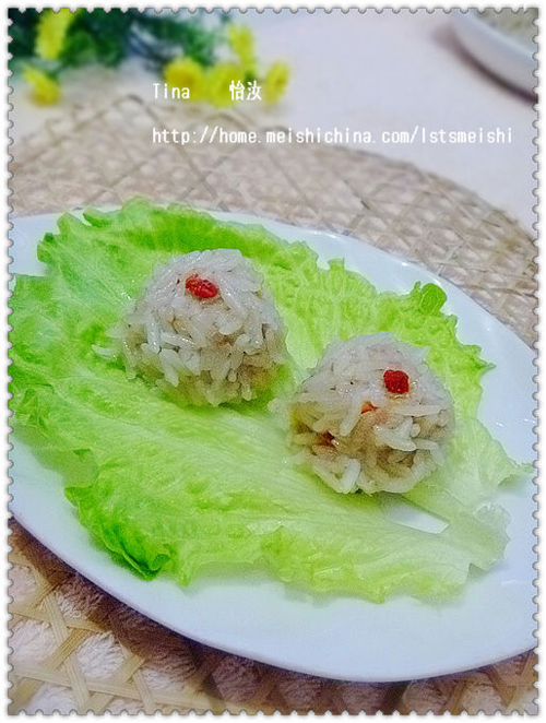 及以下步骤:盘子抹上油。或者垫上蔬菜叶子或者胡萝卜都可以。 然后用勺子把肉馅弄成丸子形状。 然后放入控净水的糯米上滚上糯米。 全部都沾好糯米放入盘子中。 然后放入蒸锅内。 然后开火蒸水开后蒸20分钟左右关火5分钟左右。 丸子整好了就是这样样子。 出锅后盘子垫上生菜叶,上面装点一点枸杞即可。 可以做成各种造型的,只要看着舒服就行。 可以做成各种造型的,只要看着舒服就行。