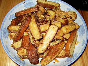 及以下步骤:下蒜片炒出香味。 把剩下的蛋液入锅,翻炒至凝固,出锅。 香干5块。 切成较厚的条。 蒜去皮切片。 鸡蛋液加盐打散。 香干条沾鸡蛋液。 入平底锅煎至两面金黄。 下蒜片炒出香味。 把剩下的蛋液入锅,翻炒至凝固,出锅。