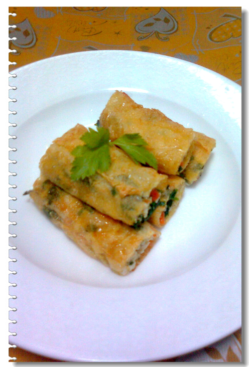 及以下步骤:取一片豆腐皮摊开,把炒好的芹菜豆腐如图放上去。 从一头卷起,尽量卷紧些,最后,用一点淀粉水封口。 封口朝下摆放。 不粘锅放油盖过底部,油热后,中小火将豆腐卷煎成表面脆黄。 取出放案板上切成均匀的小段即可。热吃凉吃都不错。 取一片豆腐皮摊开,把炒好的芹菜豆腐如图放上去。 从一头卷起,尽量卷紧些,最后,用一点淀粉水封口。 封口朝下摆放。 不粘锅放油盖过底部,油热后,中小火将豆腐卷煎成表面脆黄。 取出放案板上切成均匀的小段即可。热吃凉吃都不错。