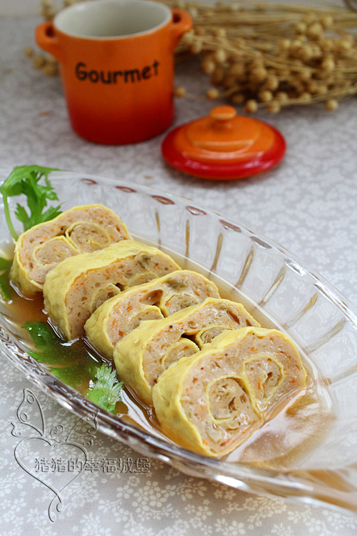 及以下步骤:搅拌均匀备用。 鸡蛋全部放入碗中打散。 把蛋液依次摊成蛋饼备用。 取一张蛋饼,均匀的抹上肉馅。 把蛋饼从两头往中间卷成蛋卷 依次卷好所有的蛋卷收口朝下摆入蒸笼。 开水上锅大火蒸20分钟。 蒸好的蛋卷切成小段。 锅中倒入高汤,放盐和蚝油调味,用水淀粉勾芡。 切好的蛋卷码入盘中,浇上芡汁。