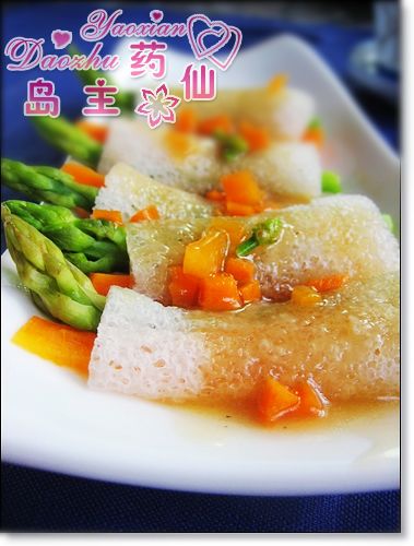 及以下步骤:先把竹笙用清水泡10分钟。 然后把泡好的竹笙改成适当的长度备用,芦笋只要头的部分,红萝卜切条。 先把竹笙用清水泡10分钟。 然后把泡好的竹笙改成适当的长度备用,芦笋只要头的部分,红萝卜切条。 先把竹笙用清水泡10分钟。 然后把泡好的竹笙改成适当的长度备用,芦笋只要头的部分,红萝卜切条。 然后把芦笋和红萝卜条穿进竹笙里面。 排好在碟子里面。 用大火蒸10分钟。 在另一个祸里加入水,生粉,糖及酱油做成芡汁淋上面即可。