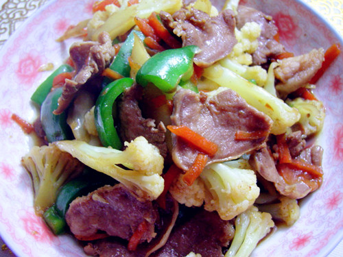 糖(适量) / 油(适量) / 生抽(适量) / 青椒(80g) / 红萝卜(80g) / 花菜(150g) / 老酒(适量)