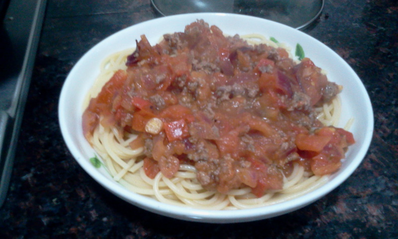 及以下步骤:将牛肉剁碎,加生粉、盐、橄榄油、酱油腌制10分钟番茄洗净,去皮(因为我和先生都喜欢连皮吃,所以就没有去了),切碎。备用洋葱洗净,切碎,备用。 煮开水后,将两人分量的意大利面放入锅中煮大约8-10分钟。 将牛肉剁碎,加生粉、盐、橄榄油、酱油腌制10分钟番茄洗净,去皮(因为我和先生都喜欢连皮吃,所以就没有去了),切碎。备用洋葱洗净,切碎,备用。 煮开水后,将两人分量的意大利面放入锅中煮大约8-10分钟。 将牛肉剁碎,加生粉、盐、橄榄油、酱油腌制10分钟番茄洗净,去皮(因为我和先生都喜欢连皮吃,所以就没有去了),切碎。备用洋葱洗净,切碎,备用。 煮开水后,将两人分量的意大利面放入锅中煮大约8-10分钟。 将牛肉剁碎,加生粉、盐、橄榄油、酱油腌制10分钟番茄洗净,去皮(因为我和先生都喜欢连皮吃,所以就没有去了),切碎。备用洋葱洗净,切碎,备用。 煮开水后,将两人分量的意大利面放入锅中煮大约8-10分钟。 热锅,加黄油,将腌好的牛肉放锅中翻炒一下。约5成熟即可。(为保持牛肉的鲜嫩,可以先将牛肉盛起,最后再放)将洋葱碎、番茄碎放锅中,加约大半碗清水煮,加盖焖2-3分钟。加入适量番茄酱(我比较爱吃亨氏的番茄酱,我觉得这个味道最正点)煮约2-3分钟。将牛肉倒入锅中,加两茶匙糖、一茶匙盐。 把意粉盛出,倒入肉酱。完成咯~~
