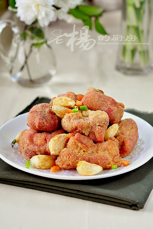 7、入热油锅,炸外壳酥脆即可。要采用二次复炸法,二次复炸的时候把蒜子丢进入,稍微炸一下。我觉得其实用烤的应该也成吧!