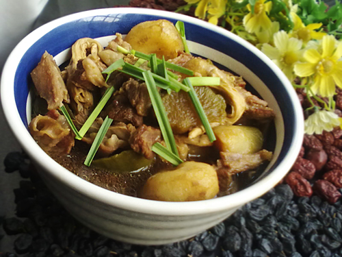 俗话说冬吃羊肉赛人参,羊肉是深受欢迎的冬令补品。据《本草纲目》记载:羊肉具有暖中补虚,开胃健力,滋肾气,养肝明目,健脾健胃、补肺助气等功效。因此,常吃羊肉可以去湿气、避寒冷、暖心胃、补元阳,对提高人的身体素质及抗病能力十分有益。 腐竹由黄豆制成,具有与黄豆相似的营养价值。腐竹具有良好的健脑作用,它能预防老年痴呆症的发生;还含有丰富的铁,而且易被人体吸收,对缺铁性贫血有一定疗效;腐竹中所含有的磷脂还能降低血液中胆固醇含量,有防止高脂血症、动脉硬化的效果