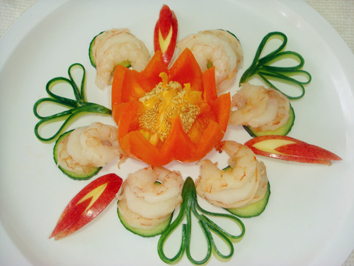 及以下步骤:将苹果切一小块,然后再小块上面再切小块,用作装饰。 最后,根据自己的喜好摆盘即可。 将买回来的急冻熟大虾解冻之后,清洗干净。 锅里放水,盐,油,酒,姜烧开,然后放解冻的大虾下去烫几分钟。(忘记拍这个步骤了) 将烫好的大虾捞起来,沥干水份。 将大虾每一只一分为二。(两片) 用一个彩椒做成花儿。 黄瓜对切,去瓜囊,然后切薄长条(四条)往里卷形成小花状。 将苹果切一小块,然后再小块上面再切小块,用作装饰。 最后,根据自己的喜好摆盘即可。