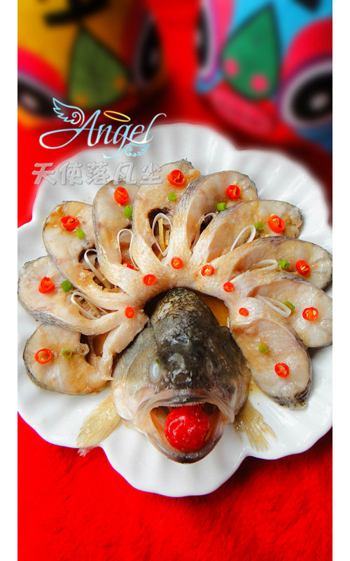 及以下步骤:准备好原料。 将鱼去掉头尾和鱼鳍,将鱼身切成连着的薄片、最后窄的部分也可以去掉或者摆在盘里。 准备好原料。 将鱼去掉头尾和鱼鳍,将鱼身切成连着的薄片、最后窄的部分也可以去掉或者摆在盘里。 准备好原料。 将鱼去掉头尾和鱼鳍,将鱼身切成连着的薄片、最后窄的部分也可以去掉或者摆在盘里。 取大小合适的盘子,下面铺上一层姜片和葱丝(第一去腥,第二受热均匀)将鱼身呈扇形摆在盘子里,均匀抹上一层食盐、鱼片之间塞上姜丝和葱丝,倒上一些料酒或白酒,鱼头摆在前面中间,鱼唇上含一颗红果脯,也蒸熟后放,鱼尾摆在后面。 放蒸锅,水开后放上鱼大火蒸8-10分钟,蒸鱼的空挡将小葱叶子、小辣椒切段备用。 将6月香豆瓣酱用适量蒸鱼豉油调和成酱汁均匀浇在蒸好的鱼上。 将小葱和红椒圈放在鱼身上装饰,另起一锅烧些热油浇在鱼身上即可。