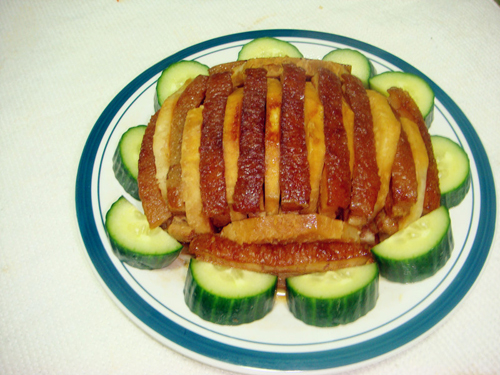 5、插好的五花肉放到一边摊凉(这样在炸的时候油就不会溅到到处都是了)然后用少许油将五花皮煎至金黄。盛起之后切薄片。