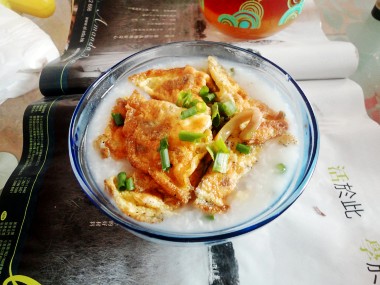 7、把煎好鸡蛋蒲在白粥上就可以开吃了