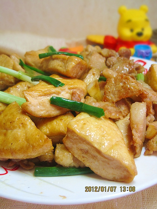 及以下步骤:翻炒五花肉变白色后加少许生抽。 待五花肉的油脂都煸炒出来后把之前煎好的豆腐倒入锅中,加半勺盐。 加入少半碗水炖煮一小会。 关火撒上葱花即可。 豆腐煎到两面金黄后盛出来备用。 锅内留点油爆香蒜米和姜丝后加入五花肉。 翻炒五花肉变白色后加少许生抽。 待五花肉的油脂都煸炒出来后把之前煎好的豆腐倒入锅中,加半勺盐。 加入少半碗水炖煮一小会。 关火撒上葱花即可。