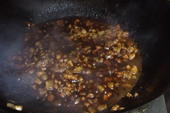 3、五花肉切成拇指指甲大小,肥瘦相间。放入油中,炒到4成熟。加入酱油,料酒,适量甜面酱,大酱。喜欢吃甜的朋友,甜面酱加多点。