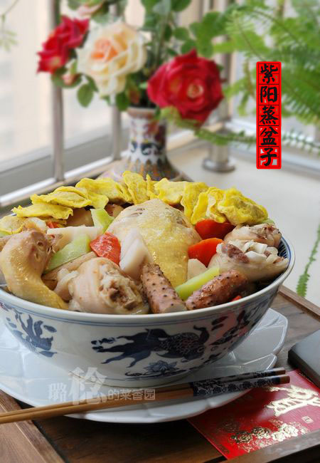 【紫阳蒸盆子】,最早发源于紫阳县汉王镇,先是汉江艄工歇脚欢聚时的荟菜,后来发展为除夕团圆饭上的压轴菜。 蒸盆子在紫阳是贵重菜,平时很少吃,只是年三十晚上的团圆饭非吃不可,作为压席大菜,欢庆旧的一年丰收,预祝新的一年美满,全家幸福,四季发财。殷实人家招待贵宾、操办红白喜事,宴席上才有这道菜。至亲厚友外出日久,归来接风,或出远门壮行,也做这道菜。蒸盆子体现了主人的一片盛意和厚道,盆大、鸡全、猪蹄厚重、蛋饺香、蔬菜多、汤汁鲜美、醇厚。