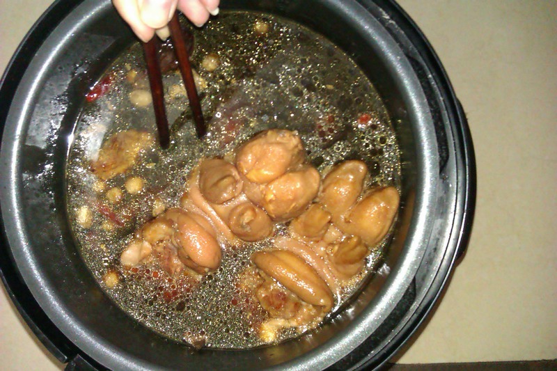 料酒(少许) / 盐(4小勺) / 冰糖(一小把) / 八角(4个) / 老抽(4汤匙) / 花椒(一小把) / 生姜(6大片) / 茴香(一小把) / 大料(一个) / 花生(半斤) / 干红椒(3个) / 白果(少许)