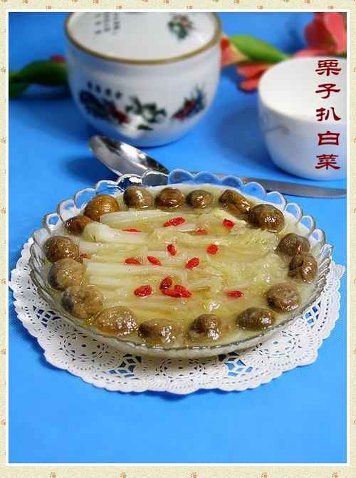 及以下步骤:待芡汁糊化后撒入几粒枸杞点缀。 然后便可出锅码盘,出盘时稍事整形,把板栗码放四周便可上桌食用。 把鸡汤倒入锅中烧开,用少许糖和盐调味。 再撒入少许胡椒粉搅匀。 然后把事先切好的白菜条从盘中平推入锅中,要保持白菜整齐不要入锅后散掉。 最后放入板栗肉用中火烧制。 在烧制过程中来回摇动炒锅,当汤汁收干60%后进行翻勺一次,把白菜烧透后用水淀粉勾芡。 最后淋入适量熟鸡油。 待芡汁糊化后撒入几粒枸杞点缀。 然后便可出锅码盘,出盘时稍事整形,把板栗码放四周便可上桌食用。