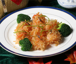 2、将大虾肉、肥猪肉剁成细泥,加鸡蛋清、清汤、精盐、味精、绍酒、葱姜汁、芝麻油拌匀成馅,然后用手挤成直径为25厘米的丸子,放在拌和好的干贝丝上滚沾均匀,成绣球状,摆于盘内上笼用旺火蒸至嫩熟取出,滗净汤汁;