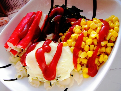 及以下步骤:鸡蛋打入水中,煮成荷包蛋。 煮熟后放在面通心粉上备用。 玉米罐头打开。【如果是冷冻的玉米粒,则要煮熟。 把玉米粒放在通心粉上。 蟹肉棒放入水中煮熟。 蟹肉棒煮熟后,剥掉外面的皮,放在通心粉上。 最后拿出番茄酱。 把番茄酱浇在上面就大功告成啦。红黄白绿很好看吧=w= 最后拿出番茄酱。 把番茄酱浇在上面就大功告成啦。红黄白绿很好看吧=w=
