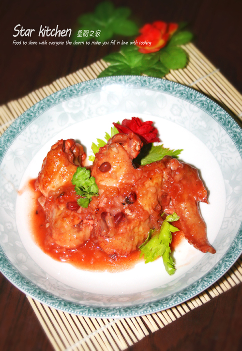 鸡肉肉质细嫩,滋味鲜美,由于其味较淡,因此可使用于各种料理中。蛋白质的含量颇多,在肉之中,可以说是蛋白质最高的肉类之一,是属于高蛋白低脂肪的食品。钾硫酸氨基酸的含量颇多,因此可弥补牛及猪肉的不足。同时也由于鸡肉比其他肉类的维生素a含量多,而在量方面虽比蔬菜或肝脏差,但和牛肉和猪肉相比,其维生素a的含量却高出许多。腿肉是从脚到腿的部位,及腿根一带的肉,其肉质颇坚硬,连皮一起摄取时,脂肪的含量较多,也是在整只鸡中铁分含量最多的一部分。 这是我年夜饭其中一道菜,味道很香甜,鸡肉的肉质很嫩,有红豆和糯米的香味,吃了让人回味无穷,很多鸡翅以炸为主,这样的鸡翅很好吃,但是很油腻,对于我们这些日常生活吃过大鱼大肉的人来说,有些习以为常,这样的做法可以让你对鸡翅有新的吃法和做法