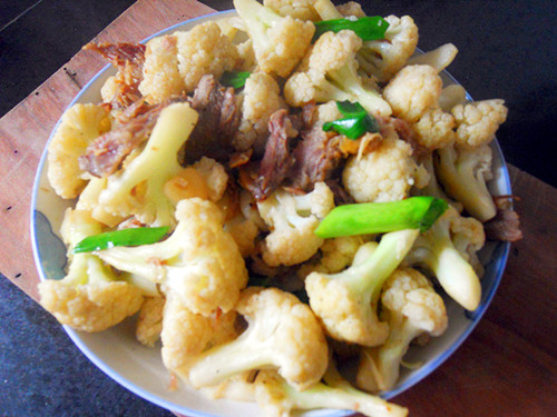 及以下步骤:很简单快手的一道菜,有营养有废物利用啦。 材料:菜花(最好焯水,因为菜花不好熟)、剩下的腊肉、蒜苗。 热油爆香蒜片。 材料:菜花(最好焯水,因为菜花不好熟)、剩下的腊肉、蒜苗。 热油爆香蒜片。 放入腊肉煸出油,炒久一点。 放入菜花炒,顺便加点水。 倒点生抽。 快要出锅时加入蒜苗,蒜苗炒到发绿就行,要不就炒过了。 很简单快手的一道菜,有营养有废物利用啦。