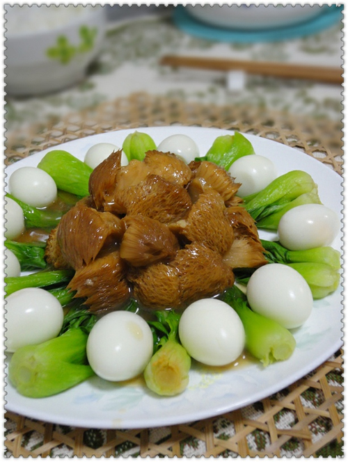 7、把猴头菇和油菜摆放到盘中,把鹌鹑蛋摆入猴头周围。