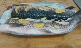 1、把鱼从中间分成两半,划几刀,身上放上姜片,葱段,盐,料酒腌制几十分钟,(盐大胆的放)