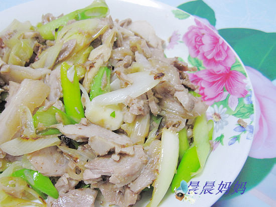 及以下步骤:再次加酱油,盐调味,炒匀盛盘。 熟肘子肉切片(事先煮好的)。 大葱斜切段。 熟肘子肉切片(事先煮好的)。 大葱斜切段。 锅中放油,放入大葱炒。 倒少许酱油炒。 放料酒调味。 放熟肘子肉炒。 再次加酱油,盐调味,炒匀盛盘。