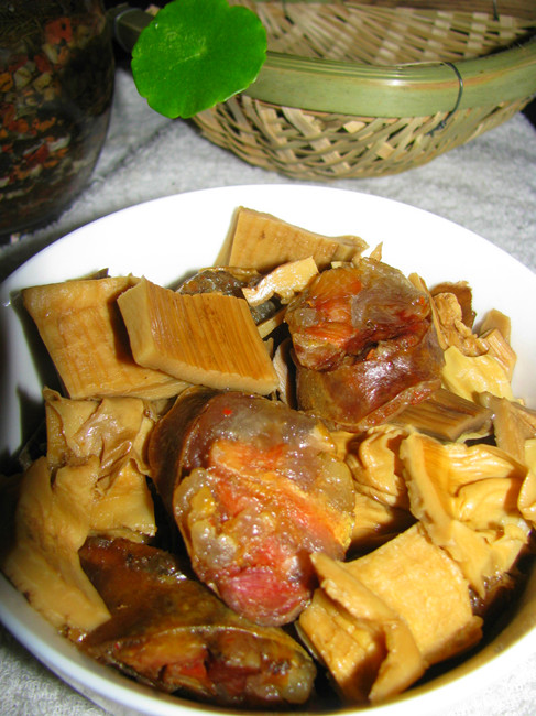 自从上次用捷赛智烹锅做了胡萝卜清炖五花肉以后,就一直没舍得用,再加上年前年后事情很多,一直没有时间做菜。 捷赛智烹锅要求提交2道试用心得,到现在都还差一篇,挺不好意思的。 昨天值完班,今天可以休息了。 正好家里有朋友送来的西双版纳竹笋,还有过年回家带来的腊肠。 想做一个竹笋炖腊肠。 竹笋低糖低脂肪和低热量,是大自然恩赐给人类的天然生态美食,各族人民都有各自的食用竹笋的高招,在西双版纳,用竹笋加工的美食可以说出百种以上。 竹笋中含的粗纤维对减肥或抑制肥胖有很大的作用。在西双版纳食用的竹笋除了人们所熟悉的鲜笋外,还有干笋(笋丝、压笋、浪笋、笋花)和酸笋(干笋丝、水笋丝),尤其腌酸笋是竹笋制品中的上乘者,烹调的酸笋鱼、酸笋鸡都是傣族的传统风味名菜;煮苦笋、烧苦笋蘸喃泌(酱)是傣家人喜爱的传统吃法;而把竹笋切碎、舂烂、煮干后做成的喃泌诺(笋酱)更是桌上的珍品,能使人胃口大开。 我今天做的就是用到了干笋。