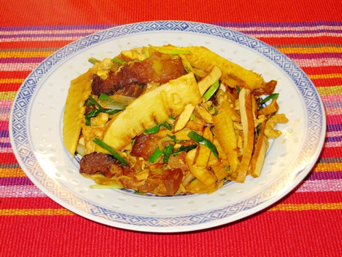 腊肉炒藠头叶是经典的家乡菜。 为了少吃腊肉,配了一点新鲜肉。我这里用的鲜肉是煮鸡汤时,从鸡身上割下来的鸡胸肉。其实配鲜猪肉或鲜牛肉都可以的。 为了吃的丰富一些,还配了冬笋和豆腐干。