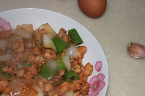 5、鸡肉炒熟后加入洋葱和辣椒 继续翻炒
