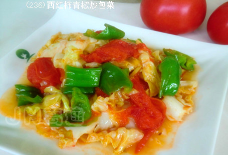 西红柿配青椒来炒包菜,味道酸甜可口。