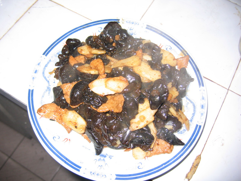 3、放入木耳。加上适量的盐和一点点的老抽。加水入味。