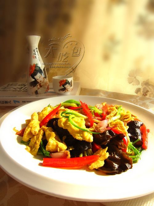 及以下步骤:主要原料大合照 鸡蛋里面滴几滴白酒,鸡蛋打散 主要原料大合照 鸡蛋里面滴几滴白酒,鸡蛋打散 主要原料大合照 鸡蛋里面滴几滴白酒,鸡蛋打散 姜切片,红椒切条,毛葱分开 油烧热后倒入鸡蛋液,放入姜片 倒入木耳毛葱翻炒,加入盐,胡椒粉和鲍鱼汁 最后放入红椒和鸡精翻炒出锅