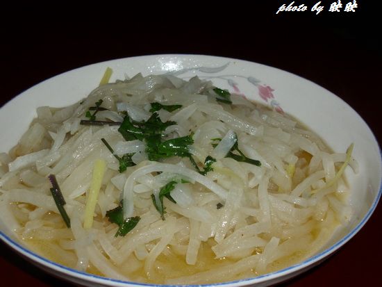 及以下步骤:白萝卜半根,洗净刨皮切丝。 姜切丝,香菜洗净切段。 白萝卜半根,洗净刨皮切丝。 姜切丝,香菜洗净切段。 白萝卜半根,洗净刨皮切丝。 姜切丝,香菜洗净切段。 锅里热油,加入白萝卜丝翻炒。 翻炒均匀后加入姜丝翻炒。 翻炒萝卜丝变软,加入1勺盐和一勺椒盐,翻炒均匀入味。 最后加入香菜即可。