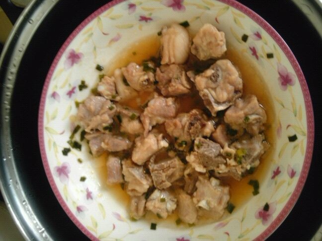 及以下步骤:开饭咯、 210g的排骨 、一根小葱就够了 把小葱切成细细的碎末 210g的排骨 、一根小葱就够了 把小葱切成细细的碎末 排骨切小块洗净(买时让老板帮忙剁一下)、放入盐、油、淀粉、生抽、葱末 拌匀、放入蒸锅 没多少会儿、排骨就开始出油 大概蒸个20分钟、整个排骨出油、变色了即表示熟了、这是出锅后的样子 开饭咯、