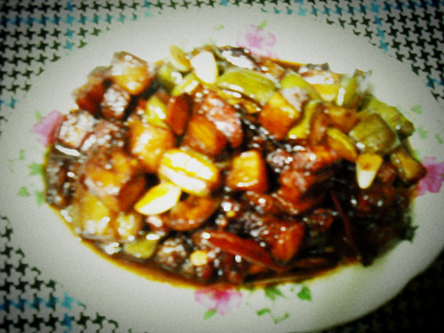 红烧肉咬一口香的都不知道姓什么了?呵呵有点夸张了,,,,说实在的很喜欢吃红烧肉,但是为了不至于长肉,还是很有节制的,,,我烧的红烧肉不是吹的这种入口即化的感觉很值得回味。茄子那,,,,它是我最喜欢吃的一个蔬菜,无论是生吃还是炖,煮,蒸,烧,拌我都爱吃,记得有一年夏天我们家足足吃掉了200多斤的茄子,呵呵都成了茄子控了。 茄子营养价值很高;含有蛋白质,脂肪,碳水化合物,维生素以及钙,磷铁等多种营养成分。长吃茄子可使血液中的胆固醇水平不至于增高,对延缓人体衰老具有积极的意义。 茄子是一个很吃油的菜,我的感觉和油水很大的红烧肉来说应该的最佳搭档了,有茄子的加入红烧肉就不感觉油腻了,这道菜是一个很下饭的才,超级好吃啊!