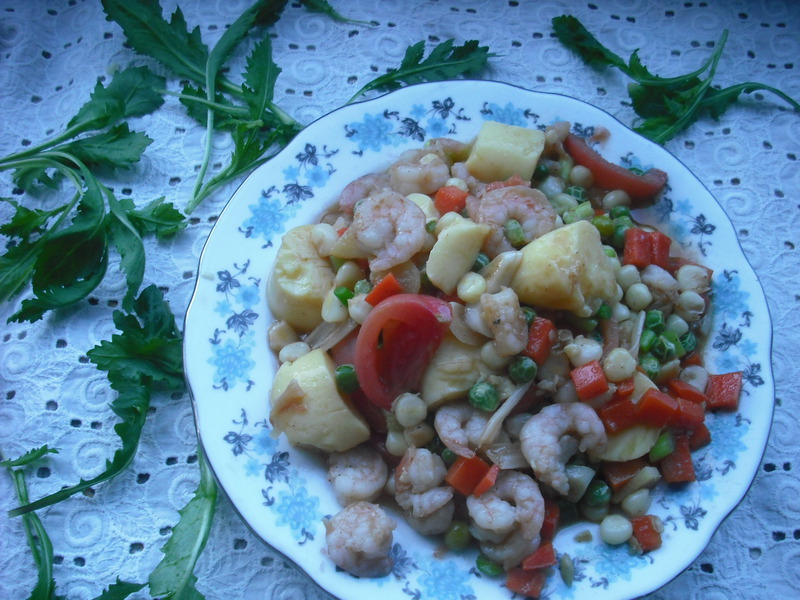 西红柿(50g) / 玉米粒(50g) / 鲜虾仁(100g) / 蒜薹(30g) / 日本豆腐(5袋) / 豌豆粒(50g)