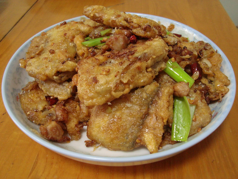 胡椒粉(少许) / 料酒(适量) / 盐(适量) / 葱(少许) / 姜(少许) / 蒜(少许) / 蛋液(100克) / 花椒(适量) / 干辣椒(适量) / 五花肉(200克) / 干淀粉(100克)
