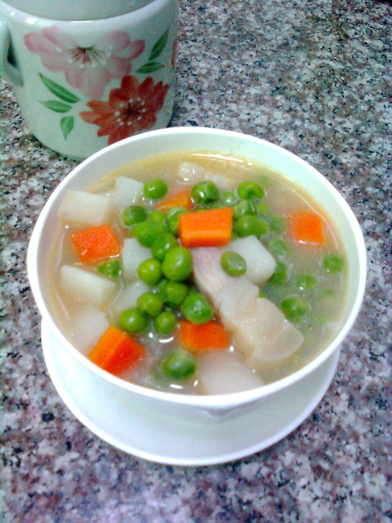 胡萝卜(适量) / 山药(适量) / 豌豆(适量) / 咸肉(适量)