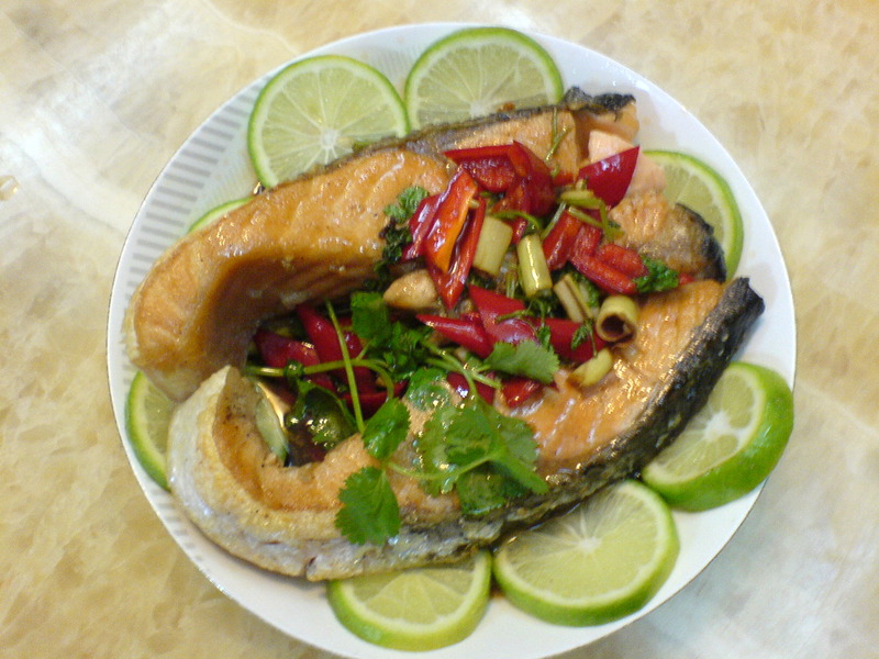 及以下步骤:三文鱼洗干净,用胡椒粉和盐腌20分钟。 香茅、红辣椒、柠檬、香菜、柠檬切碎备用。 三文鱼洗干净,用胡椒粉和盐腌20分钟。 香茅、红辣椒、柠檬、香菜、柠檬切碎备用。 三文鱼洗干净,用胡椒粉和盐腌20分钟。 香茅、红辣椒、柠檬、香菜、柠檬切碎备用。 调料有糖、鱼露、蚝油、柠檬汁、胡椒粉。 烧红锅,倒入橄榄油大火把三文鱼两面煎至金黄上碟备用。 挤几滴柠檬汁把鱼露蚝油和白糖调匀,中火煮开,倒入香茅、辣椒、柠檬碎、香菜爆香熄火。 将汁料淋到三文鱼上,大功告成!
