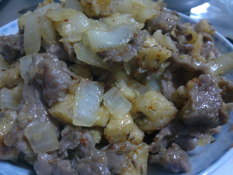 及以下步骤:加入馕丁和肉,加入葱姜蒜,辣椒面,孜然,盐,花椒面 翻炒即可出锅 馕切成丁 切成丁的馕,过油炸一下 圆葱切成丁 牛肉切成小片 牛肉过油滑一下 先煸炒一下圆葱 加入馕丁和肉,加入葱姜蒜,辣椒面,孜然,盐,花椒面 翻炒即可出锅