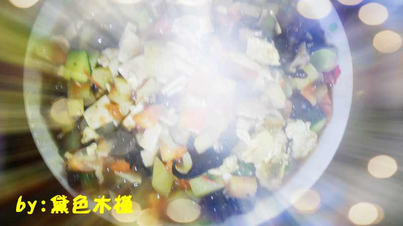 鸡蛋(适量) / 胡萝卜(适量) / 番茄(适量) / 香菇(适量) / 木耳(适量) / 马铃薯(适量) / 卤豆皮(适量)