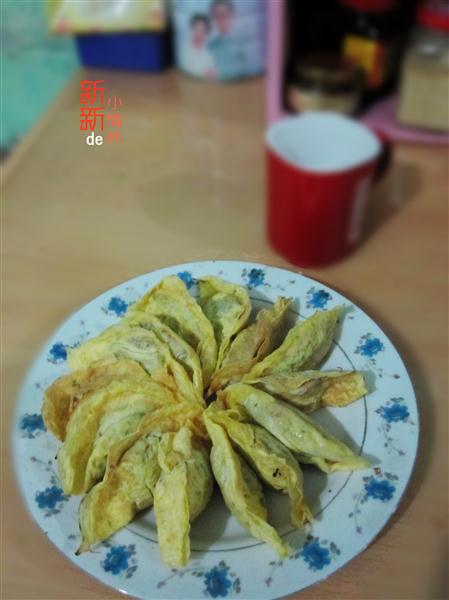 6、看蛋皮周围有点干的时候,用筷子翘起一边蛋皮,闭合蛋饺,就可以了。