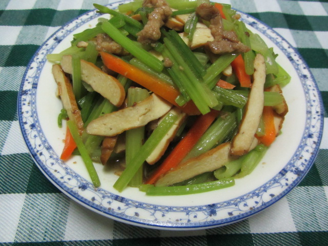 三丝炒芹菜:香干、胡萝卜、肉丝炒芹菜。很普通的家常菜