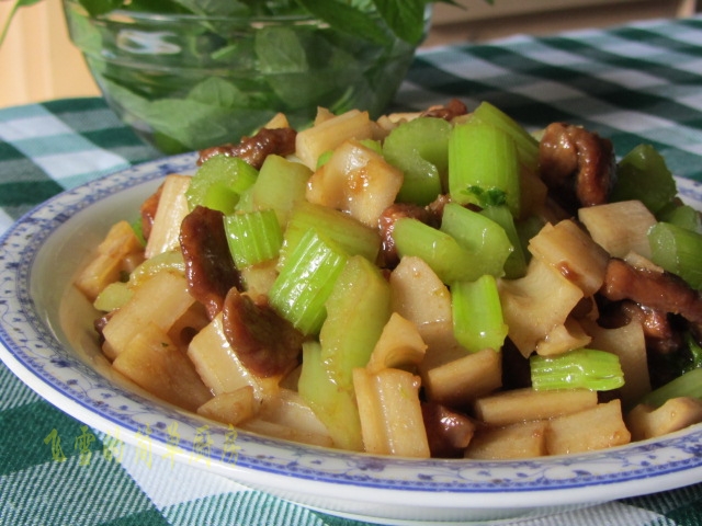 很简单爽口的菜:芹菜精肉炒藕丁。