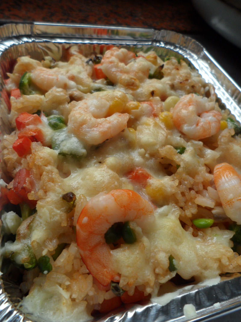 及以下步骤:把炒好的米饭,放入一次性烤盘中。 摆入虾仁。 表面放上马苏里拉芝士碎。 放入烤箱中,上火,180度,烤至虾仁熟和芝士融化即可。 完成图 把炒好的米饭,放入一次性烤盘中。 摆入虾仁。 表面放上马苏里拉芝士碎。 放入烤箱中,上火,180度,烤至虾仁熟和芝士融化即可。 完成图