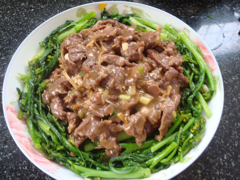 及以下步骤:用滚油大火炒后用慢火把盖1分钟不要加水。 不要煮太久,刚刚熟就好。 直接把牛肉放在之前煮好的菜面上就好了。 再用冷水冲洗下跟蒜容炒 炒好了。 上碟待用。 再炒牛肉。 用滚油大火炒后用慢火把盖1分钟不要加水。 不要煮太久,刚刚熟就好。 直接把牛肉放在之前煮好的菜面上就好了。