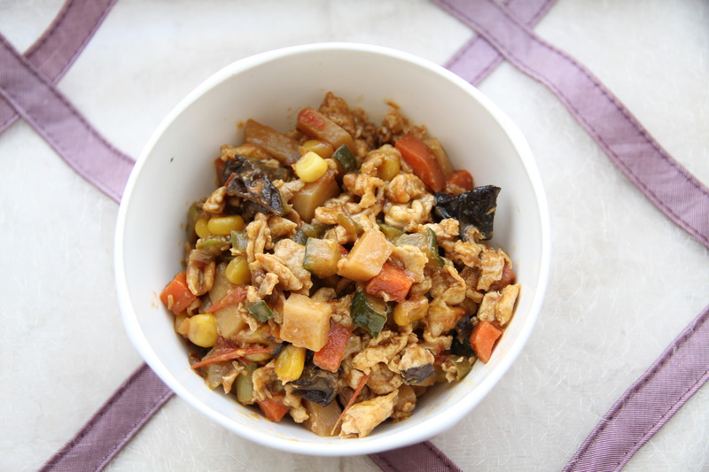 鸡蛋(一个) / 青椒(一根) / 胡萝卜(一小块) / 西红柿(半个) / 黄瓜(半根) / 土豆(半个) / 木耳(少许) / 玉米粒(少许)