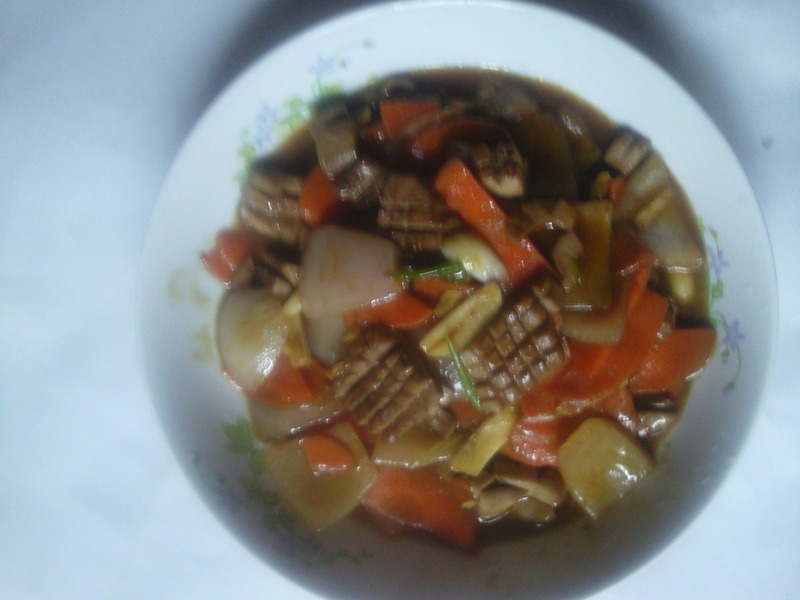 盐(少许) / 糖(1勺) / 蒜片(适量) / 洋葱(半个) / 香醋(少许) / 生抽(3勺) / 淀粉(适量) / 胡萝卜(半根) / 白醋(2勺) / 姜丝(适量)