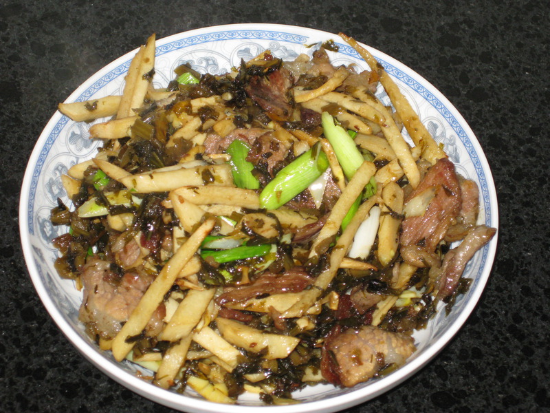今天下班回到家里,也懒得到菜场去买菜,打开冰箱看见有昨天从乡下拿来的雪菜和春笋,就做个雪菜肉丝炒春笋吧!很下饭。