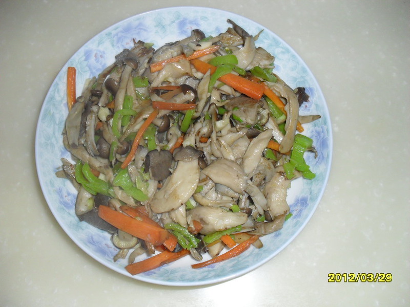 及以下步骤:出锅前加上,鸡精、蒜,盛盘即可 蘑菇去根,平菇掰成小块,用水洗干净 用水把蘑菇焯一下 蘑菇去根,平菇掰成小块,用水洗干净 用水把蘑菇焯一下 焯好沥干备用 把青椒、胡萝卜、葱花切丝,蒜切丁和沥干的蘑菇一起备用 油烧开,放入葱花,爆香后放入蘑菇,再加上盐、胡椒粉翻炒两分钟 再放入青椒胡萝卜一起翻炒 出锅前加上,鸡精、蒜,盛盘即可